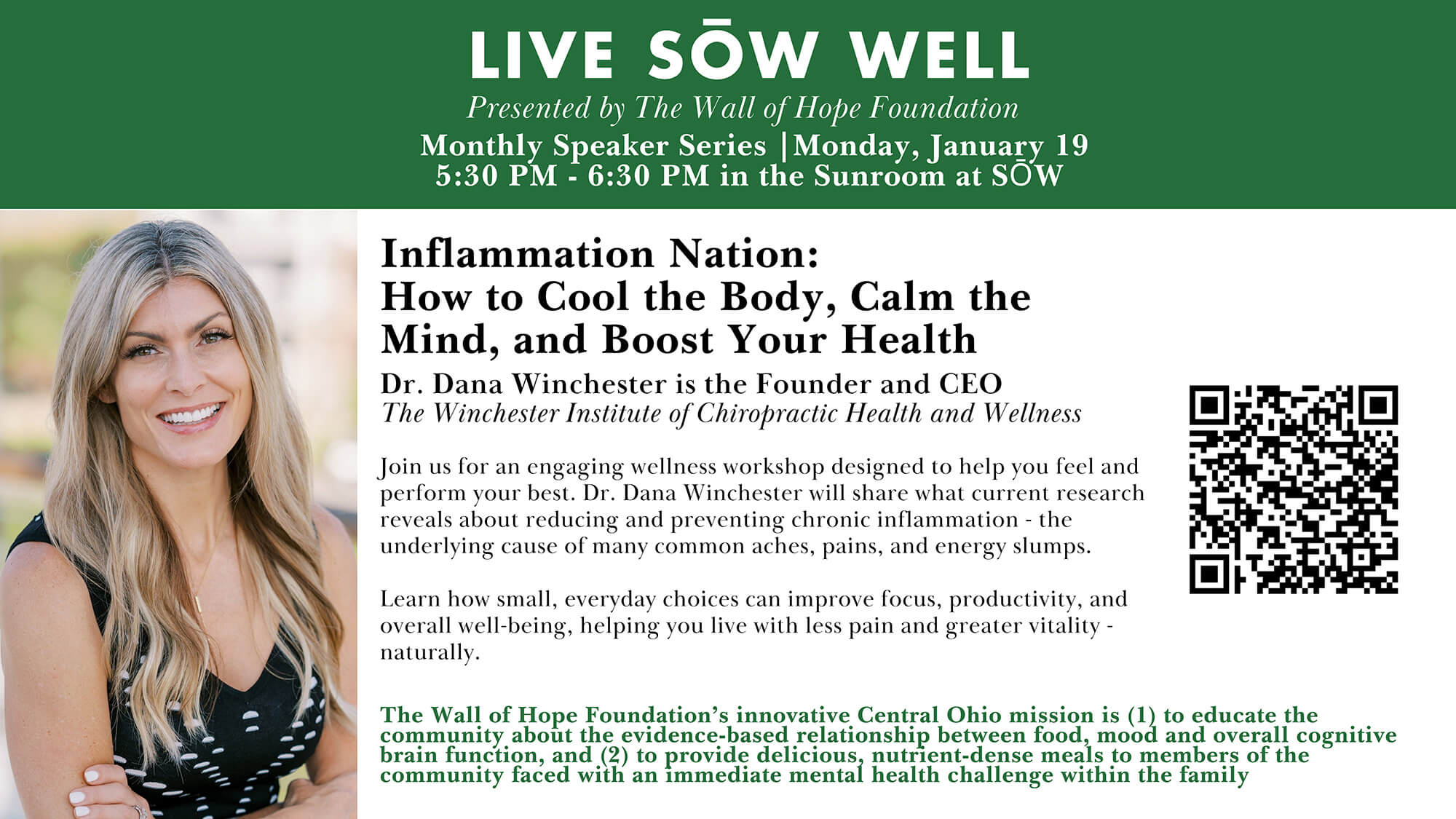Join us for an engaging wellness workshop designed to help you feel and perform your best. Dr. Dana Winchester will share what current research reveals about reducing and preventing chronic inflammation – the underlying cause of many common aches, pains, and energy slumps.